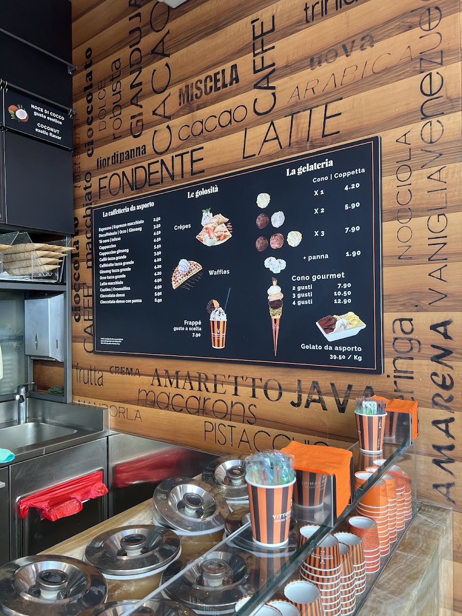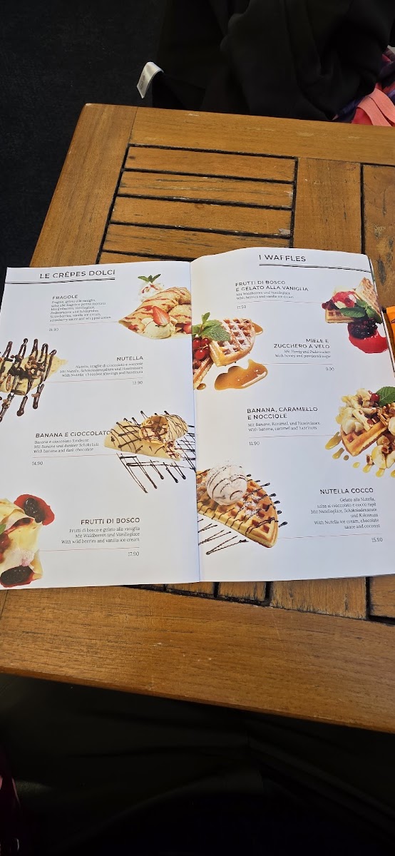 The menu features comforting drinks like rich hot chocolate, smooth espresso, and creamy café latte, ideal for mornings or afternoon breaks. For those seeking something light and satisfying, small plates such as waffles with caramel and banana or delicate crepes with Nutella complement the café’s relaxed setting. The ice cream and gelato options, including pistachio and dark chocolate flavors, add a refreshing touch to warm days or serve as a sweet finale after a casual meal.